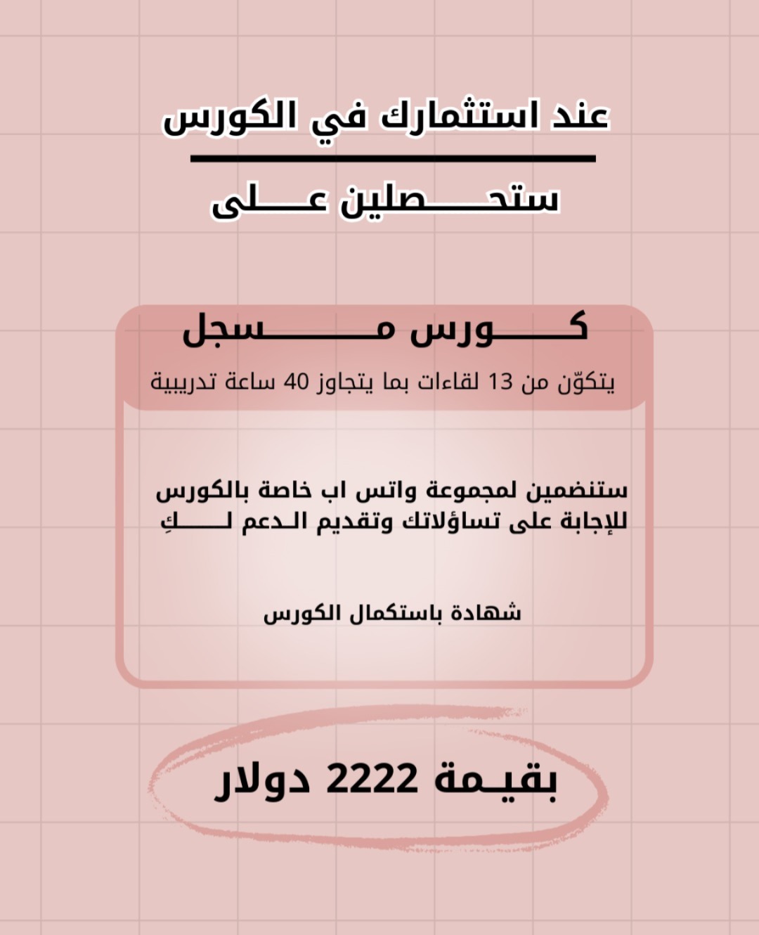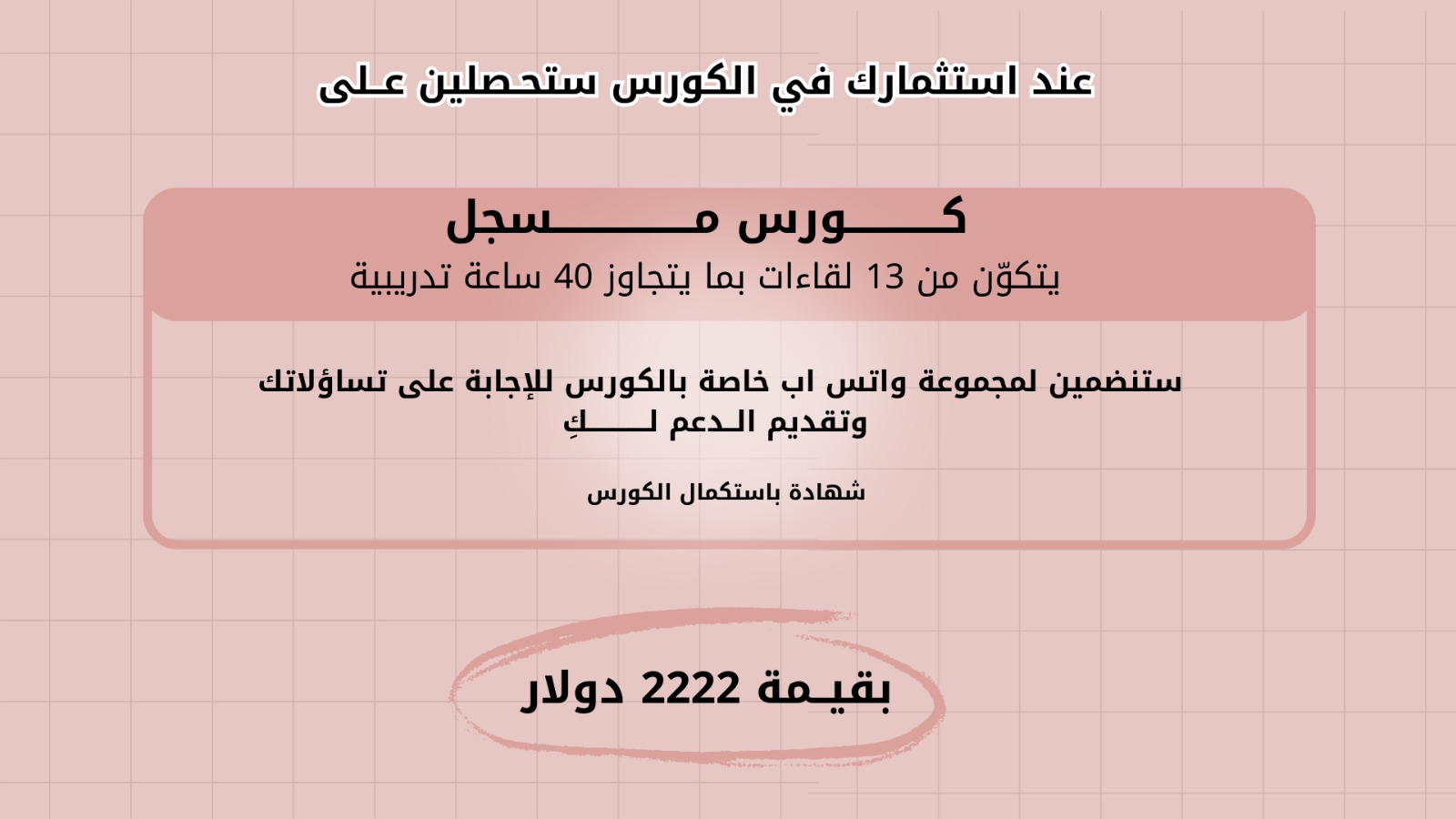 الكورس مُسجّل، وهو عبارة عن ١٤ لقاء، كل لقاء يمتد من ساعتين ونصف الى ٣ ساعات ونصف